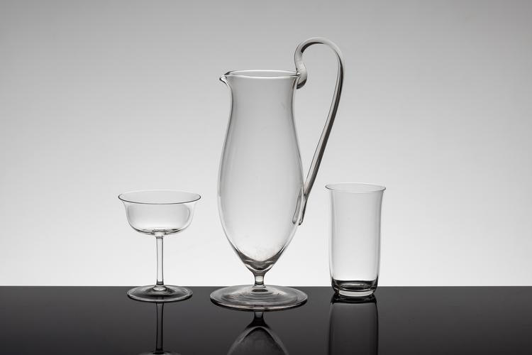 Rakousko, podle návrhu J. Hoffmanna v r. 1917 nápojové soupravy Patrician, čiré sklo, foukané do formy, 13 ks: 1 ks karafa, 6 ks sklenic na vodu, 6 ks sklenic na víno, výška karafy 28 cm 3 min. oťuky na hraně