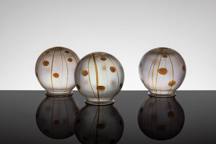 Čechy, výroba fa Johann Loetz Witwe, sklárna Klášterský Mlýn, kolem 1902/04, vrstvený briliantový opál s natavenými nitkami a puntíky z čirého hnědého skla (candia), irizovaný povrch, výška 13 cm