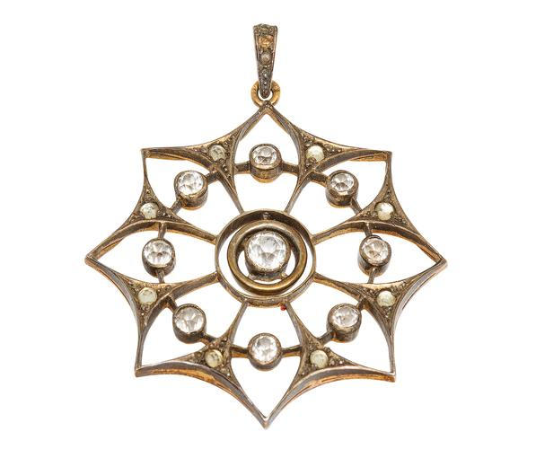 nečitelný punc, Čechy, 1. třetina 20. stol., zlato, ryzost 585/1000 g, hmotnost brutto 6,62 g, safíry, stříbro 800/1000 g, středový safír v pohyblivé montáži, délka 5 cm, dva drobné kamínky na úchytu závěsu chybí