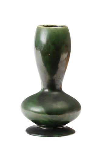 výrobní číslo 81 28, Čechy, návrh P. Janák kolem r. 1915 pro sdružení Artěl, Svijany – Podolí u Turnova, výroba fa Graniton Werke Svijan Podolí Rydl & Thon, glazovaná měkká kamenina, zelené stékavé glazury, baňaté tělo s projmutým protáhlým hrdlem, výška 26 cm