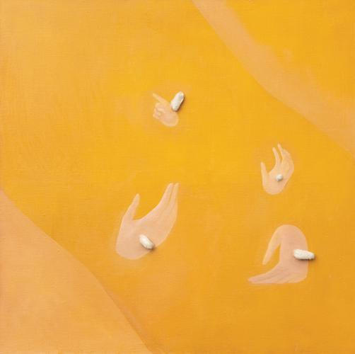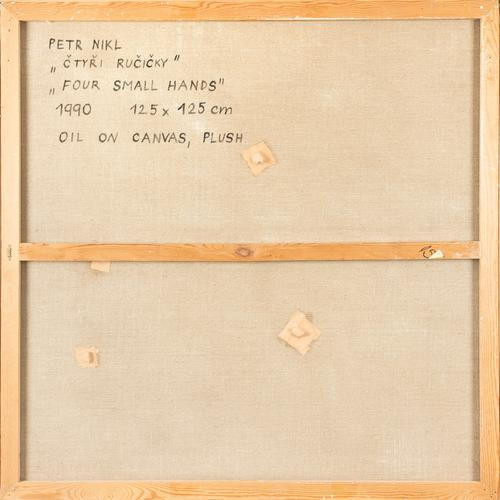 sign. na rubu LN PETR NIKL „ČTYŘI RUČIČKY“ „FOUR SMALL HANDS“ 1990 125 × 125 cm OIL ON CANVAS PLUSH, 125 × 125 cm, olej, plátno, plyš. Provenience: dílo pochází z významné pražské sbírky.