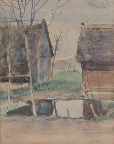 Celou generaci zásadně ovlivnila výstava norského expresionisty Edvarda Muncha pořádaná roku 1905 v Praze Spolkem výtvarných umělců Mánes. Kubišta trávil mnoho času jako mladík v rodinném venkovském domku ve Vlčkovicích u Hradce Králové, což dokládají tušové kresby ve skicáři. Již v nich lze vystopovat úsilí o tvárné pojednání viděné skutečnosti ve zvoleném formátu. Dvě hmoty chalup po stranách s průhledem uprostřed vytvářejí vědomou hmotovou skladbu vyznívající oscilací ne nepodobnou hudebnímu myšlení počítání na těžké a lehké doby. Tento akvarel se váže k oleji U nás na dvoře z NG Praha a ještě více k výškově situovanému oleji Stromy v létě, publikovaným černobíle v monografii dr. Mahuleny Nešlehové. Tamtéž je uveden i akvarel Krajiny s datací 1.5.05, do tohoto období jara a léta 1905 kladu i tento kus z význačné moravské sbírky.