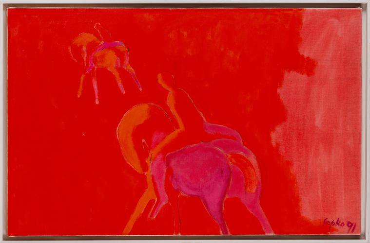 Předložený obraz „Jezdci“ je nezpochybnitelně autentickým, na trhu s uměním raritním, vitální potřebu svobody transponujícím dílem Jiřího Sopka, jednoho z nejžádanějších umělců fenoménu tzv. Nové figurace a někdejšího profesora a rektora Akademie výtvarných umění v Praze, jehož ostře barevná plátna jsou uhrančivá, veselá i melancholická, skvostná jak klenoty i dráždivá jak papoušci hýřící pestrobarevným peřím. Jsou zkrátka nepřehlédnutelná, evokující velice naléhavé významy a pocity, obecně lidské i zcela aktuální. Člen Volného seskupení 12/15 Pozdě, ale přece, který se zařadil na piedestal klasiků české výtvarné scény druhé poloviny dvacátého století, se na profilu české výtvarné scény podílí již bezmála šest desetiletí. Jiří Sopko poprvé vystavoval roku 1967 ve Špálově galerii na výstavě „Nová jména“, jež uvedla na scénu současně jména jako Z. Sion, J. Hilmar, R. Němec, T. Rajlich, O. Kulhánek, M. Ševčík a další. Tehdy si autor hned získal respekt, aby se jeho výtvarný projev rychle ustálil v nesmírně osobité poloze svědka a komentátora groteskní lidské komedie. U Jiřího Sopka má slovo malíř „čistotu základního pojmu“, jak trefně napsala Dr. Eva Petrová u výše uvedené výstavní příležitosti. Jiří Sopko celou svou výtvarnou kariérou ukázal, co vše (stále ještě) dokáže barva, štětec a plátno v podání výrazné, v sobě zakotvené umělecké osobnosti. Jiří Sopko se narodil roku 1942 do rodiny právníka a učitelky v obci Dubová na Podkarpatské Rusi, odkud se rodina krátce poté odstěhovala do Dunajské Stredy, kde žila až do chlapcových jedenácti let. S atmosférou oblasti Žitného ostrova souvisí také autorovy první autentické vizuální pocity. Kult tepla, slunce a vody se později stal trvalou inspirací jeho tvorby. Příkrým kontrastem k tomuto prostředí bylo Kladno, kam se rodina přesunula poté, když jeho otec přišel, jako jeden z mnoha právníků první republiky, o právnickou licenci a byl poslán na práci v ocelářských hutích. Temné prostředí průmyslového města jen posílilo malířovu pozdější touhu po barvě, která se stane jeho „tvůrčí potřebou“. Následují léta studií - nejprve na Střední výtvarné škole v Praze. Krátkou epizodou bylo studium na keramické škole v Bechyni. Následně je Sopko přijat na Akademii výtvarných umění v Praze, nejprve do ateliéru Jiřího Horníka, po jehož smrti přechází k Vlastimilu Radovi a nakonec zakotví u Antonína Pelce, jehož tolerance umožnila dozrání jeho přirozeného talentu. Byl to ostatně Antonín Pelc, kdo svému žákovi zapůjčil monografii belgického symbolisty Jamese Ensora, která rozhodla o dalším vývoji mladého umělce. Ensor Sopka uhranul jak svým groteskním způsobem vyjádření, tak veselým, absurdním kolorismem. Jiří Sopko patří ke generaci umělců, kteří na výtvarnou scénu vstoupili v době počínající normalizace. Kulturní uvolnění šedesátých let zažil jako student a bezprostředně po srpnové okupaci ještě strávil několik měsíců na stipendijních pobytech na Kypru a ve Francii. První samostatnou výstavu měl v pražské Nové síni v létě 1970. Pak ale přišly zákazy, odchod z místa asistenta na Akademii a nemožnost vystavovat. Prostředkem obživy se mu tak stalo restaurování památek. I když se vlastní tvorbě mohl tehdy věnovat prakticky jen o víkendech, o jeho obrazy byl dál zájem, jak mezi sběrateli, tak i odbornou veřejností. Více příležitostí vystavovat dostal až v druhé polovině osmdesátých let. Předložený obraz „Červení jezdci“ je reprezentativní a krásnou ukázkou umělcova tvůrčího přístupu v devadesátých letech, kdy malíř, ocitající se na druhém vrcholu svých tvůrčích a životních sil (v roce 1991 mu bylo čtyřicet devět let), zůstává věrný sám sobě: stále pojímá malbu jako formu osobní existenciální výpovědi, v jeho koncepci obrazové plochy stále dominuje barva jako hlavní vyjadřovací prostředek a stylizovaná figura jako hlavní nositel významů. Toto plátno, držené v mimořádně opticky úderné dominantní červeni, doplněné jen dalšími čtyřmi tóny, prezentuje vývojově důležitý motiv jezdců, který posouvá autorovo zaměření k nadosobním a nadčasovým významům. Námět jezdce na koni, tradičně symbolizující sílu, rychlost, důstojnost a svobodu, ale taktéž vnitřní sílu či touhu, je zde typicky sopkovsky groteskně vypointován až humorně širokým posedem. Autor nám zde předkládá své „ecce homo“, podprahově vázané na vlastní jezdecké zážitky v dětství, vypovídající o lidské cestě životem i o pudovém spění za volností a svobodou.