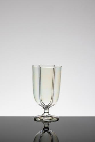 Rakousko, návrh J. Hoffmann nebo jeho okruh inspirovaný tvary tradičního nápojového skla vyráběného u firma J. Meyra synovec v průběhu několika desetiletí, pravděpodobně kolem 1925, realizace firma Karlovarské továrny na křišťálové sklo A.-G., Ludwig Moser & synové a Meyra synovci, Karlovy Vary a Vimperk, tenkostěnné čiré bezbarvé sklo s irizovaným povrchem, foukané do laločnaté optické formy, výška 14,2 cm
