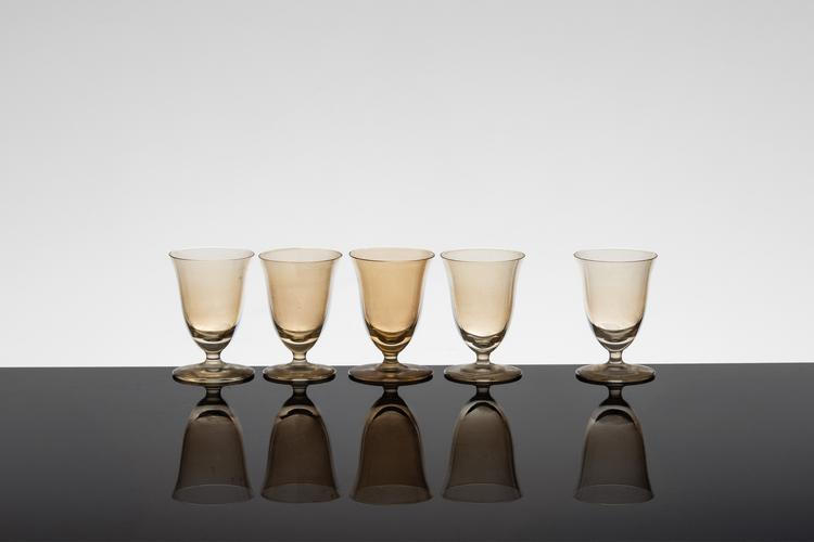 Rakousko, návrh J. Hoffmanna nebo jeho okruh pro Wiener Werkstätte kolem r. 1916/23, realizace v některé české sklárně, čiré bezbarvé sklo (tzv. mušelínové) se zlatě irizovanými povrchy, výška 6 cm