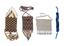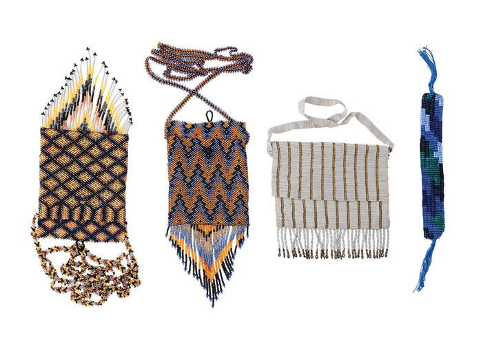 Rakousko, návrh pravděpodobně J. Hoffmann nebo M. Likarz- Strauss pro Wiener Werkstätte kolem r. 1925, skleněné korálky, textil, bíle barevná jehněčí kůže, 4 ks: 2 ks kabelka s korálkovým závěsem přes rameno a zapínáním, 1 ks kabelka na předloktí s vnitřní koženou vložkou, 1 ks náramek, max. rozměr kabelky 16 × 10 cm