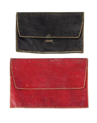 Rakousko, návrh J. Hoffmann pro Wiener Werkstätte kolem r. 1925, kůže černě a červeně barvená, zlacený dekor, rozměr 26 × 10,5 a 14 × 9 cm, stopy užívání