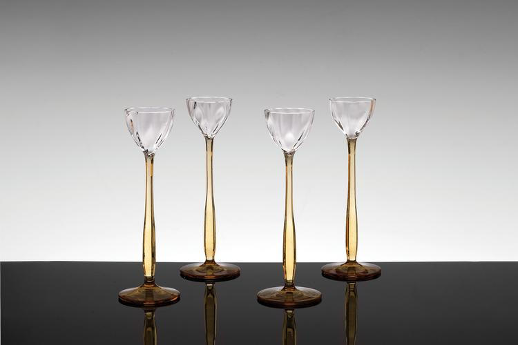 Rakousko-Uhersko, návrh K. Moser pro fa E. Bakalowits & Söhne, kolem r. 1900, medová nožka, čirá opticky dekorovaná kupa, v. 18,5 cm. Archiv WW (MAK) inv. č. GL 2543.