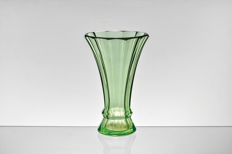 Rakousko-Uhersko, provedení pravděpodobně firma Meyr‘s Neffe, Vimperk, kolem r. 1916, zelené sklo, fasetovaná kupa i nožka, výška 25 cm