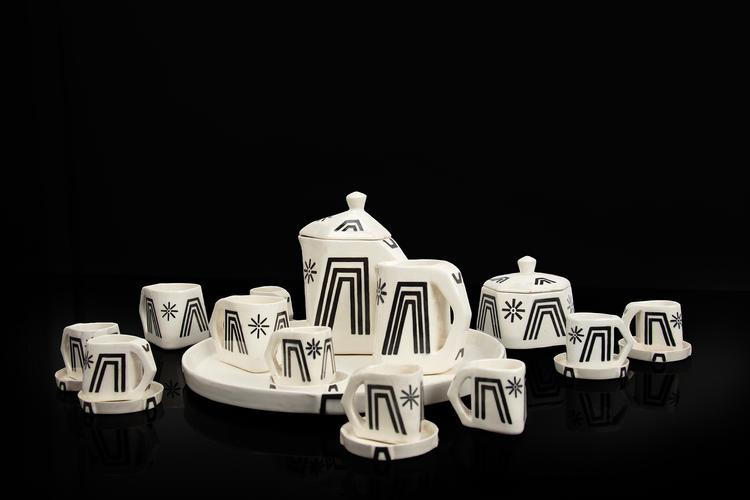 Čechy, návrh V. Hofman pro Artěl, výroba fa Graniton Werke Svijan Podolí Rydl & Thon, 20. léta 20. století, keramika s černě malovaným dekorem, 14 ks: 1 ks konvička s víčkem (výška 18 cm), 1 ks mléčenka, 8 ks šálek s podšálkem (1 ks podšálek chybí), 2 ks malá konvička, 1 ks cukřenka s víčkem, 1 ks servírovací tác (průměr tácu 33 cm)